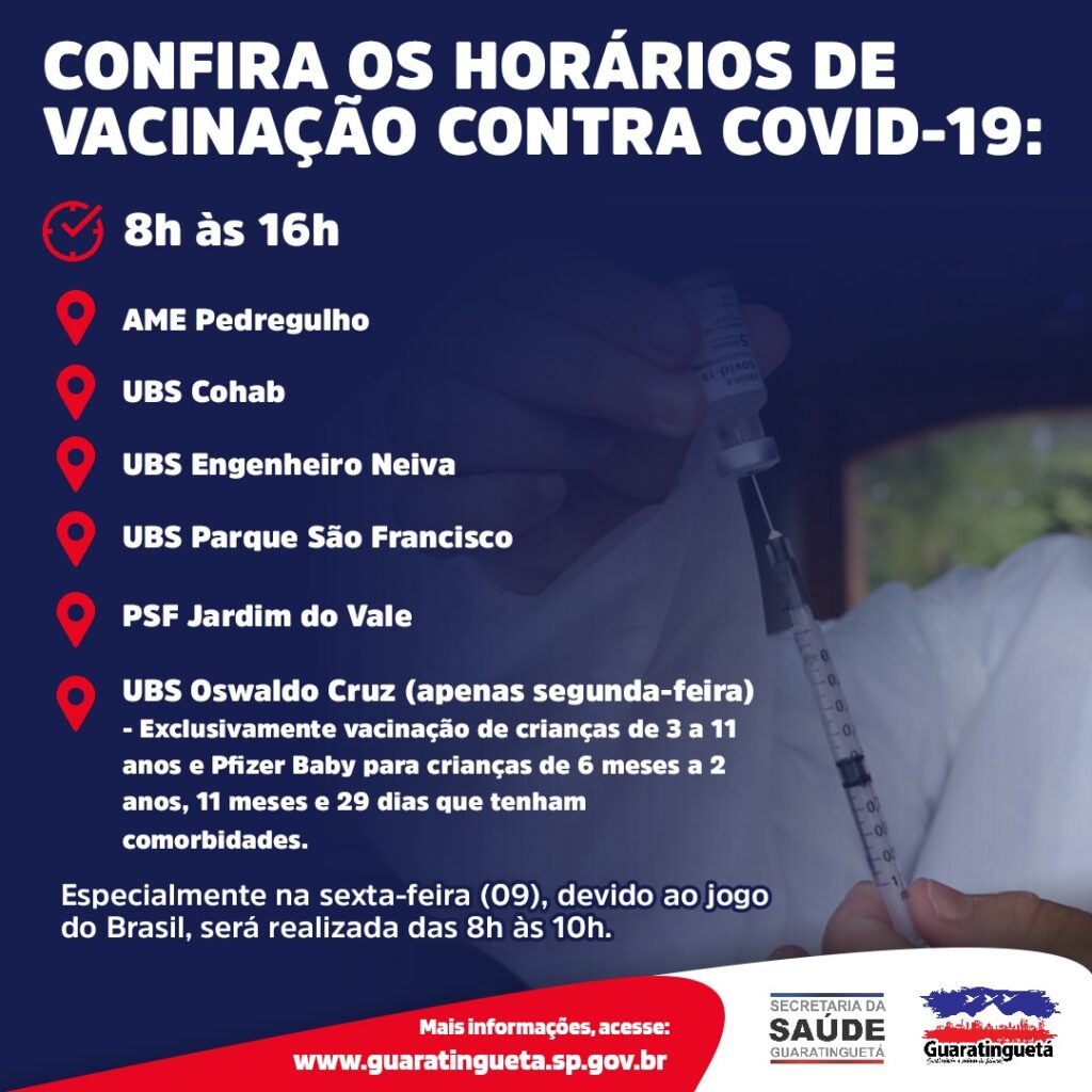 A Secretaria de Saúde de Guaratinguetá informa que a imunização contra Covid-19 continua nesta semana. A vacinação ocorre das 8h às 16h e especialmente na sexta-feira (09), devido ao jogo do Brasil será realizada das 8h às 10h. Unidades de vacinação: 📍AME do Pedregulho📍UBS Cohab📍UBS Engenheiro Neiva📍UBS Parque São Francisco📍PSF Jardim do Vale 📍UBS Oswaldo […]